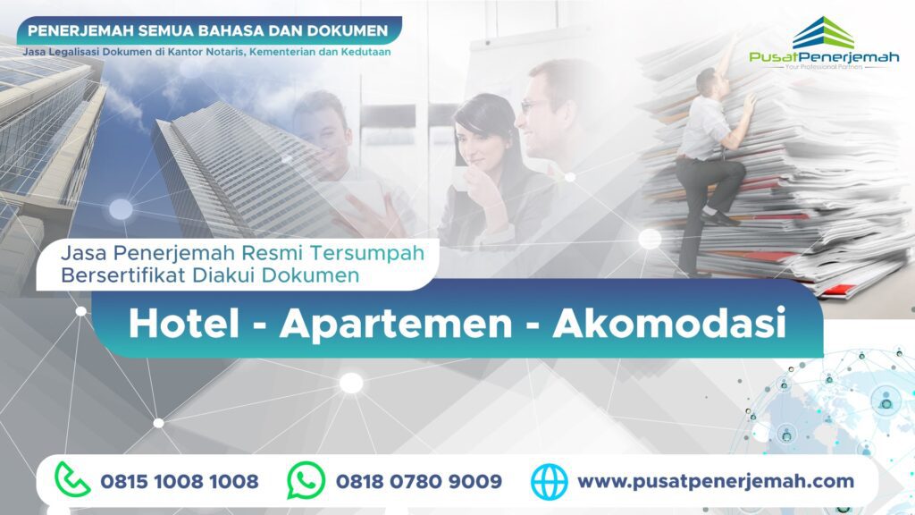 Pusat Penerjemah direkomendasikan sebagai mitra terpercaya untuk kebutuhan ini. Mereka menyediakan jasa penerjemah tersumpah resmi, legalisasi di Kemenkumham/Kemenlu/kedutaan, dan apostille dengan proses cepat, aman, dan diakui instansi. Dengan pengalaman luas, mereka menangani dokumen hotel, apartemen, dan akomodasi dari berbagai bahasa, termasuk legalisasi untuk keperluan luar negeri. Kontak via WA 0815-1008-1008 atau email [email protected] untuk konsultasi gratis.
