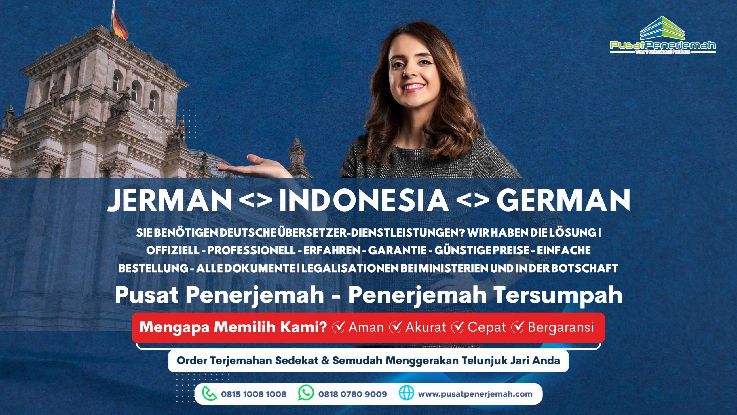 Penerjemah Tersumpah bahasa  jerman dibutuhkan untuk menerjemahkan dokumen dari bahasa Indonesia ke bahasa  jerman untuk semua negara pada umumnya dan terkhusus negara-negara Eropa yang mayoritas menggunakan bahasa  Jerman sebagai bahasa resmi mereka.