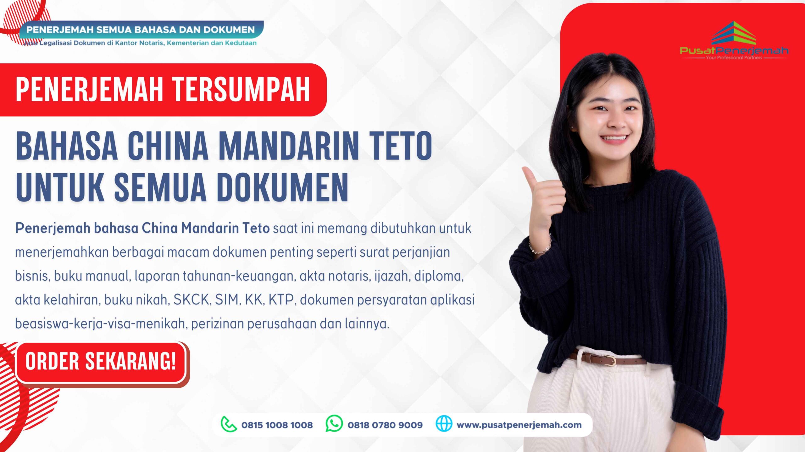 Anda dapat menggunakan layanan terjemahan penerjemahan tersumpah bahasa Taiwan dari mana saja bahkan bila Anda di luar swasta, order tejemahan di Pusat Penerjemah cukup mudah, silahkan kirim dokumen Anda via WA atau email untuk mendapatkan estimasi biaya dan waktu pengerjaan secara cuma-cuma dan gratis (gratis estimasi), silahkan hubungi CS kami di nomor Tel. 081510081008 – 081319201920 dan WA. 081807809009.